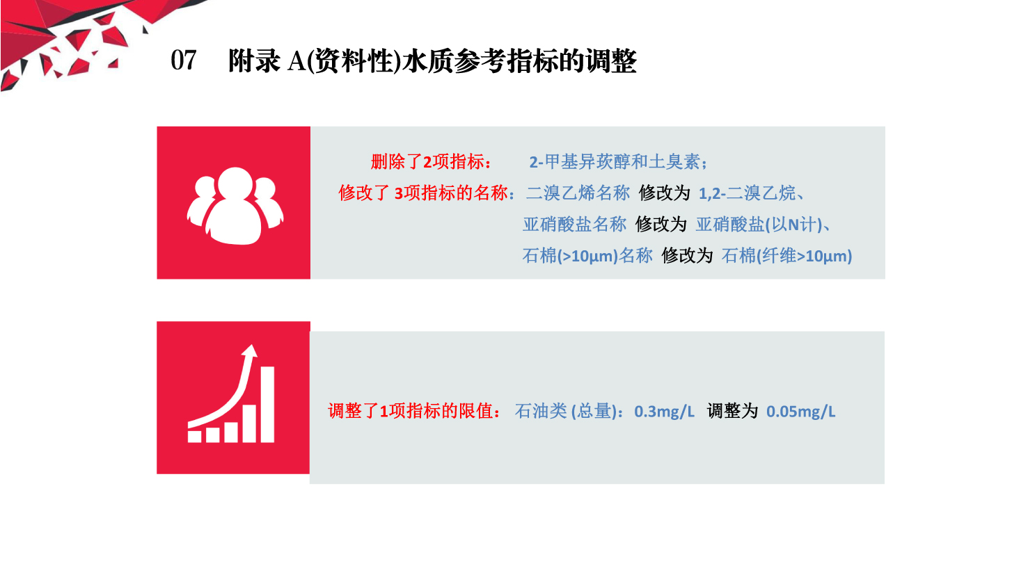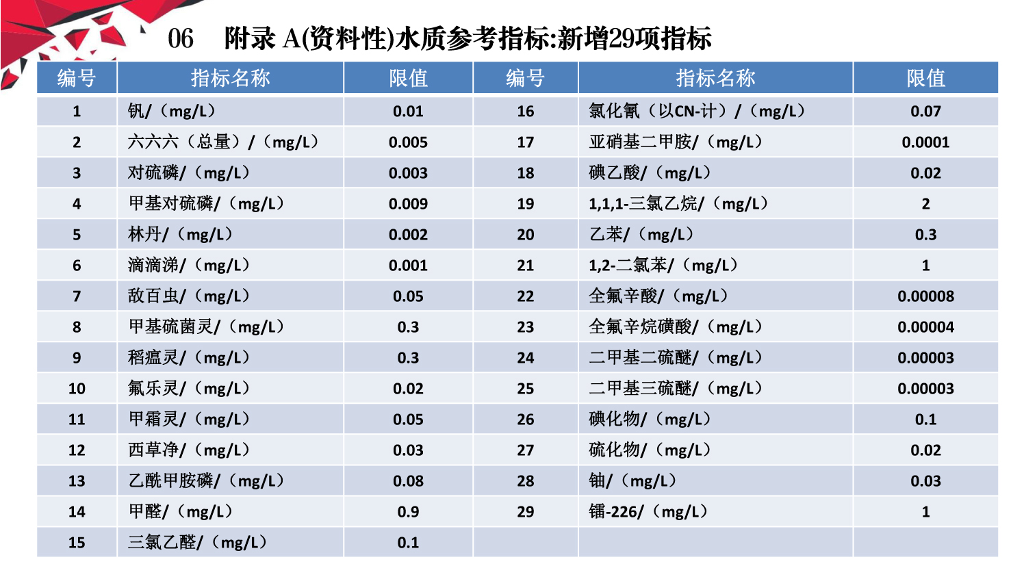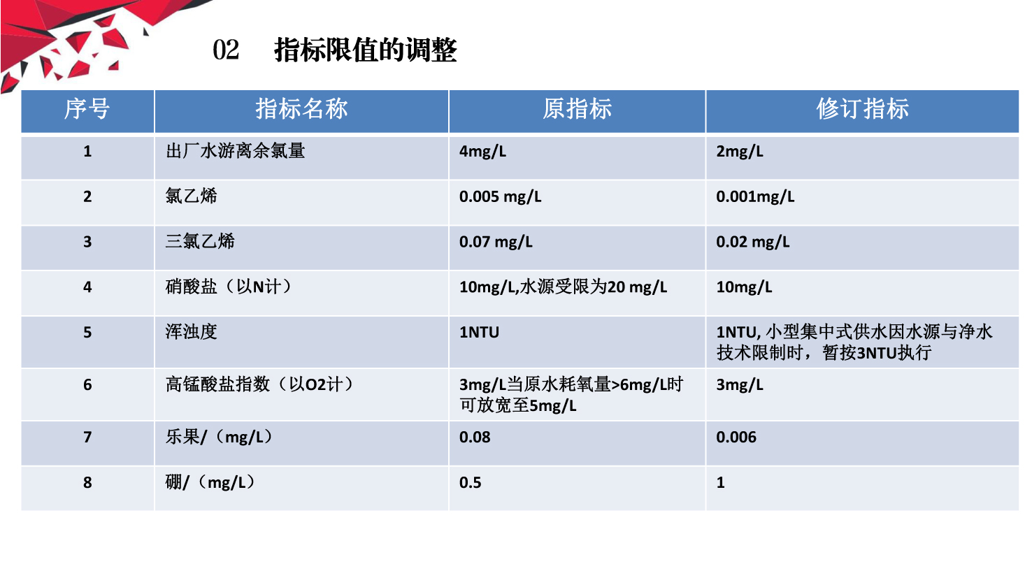 《化妆品生产质量管理规范》第三十三条规定,企业生产用水的水质和水量应当满足生产要求,水质至少达到生活饮用水卫生标准要求。新版GB 5749-2022《生活饮用水卫生标准》于2022年3月15日经国家市场监督管理总局(国家标准化管理委员会)批准发布,代替GB 5749-2006《生活饮用水卫生标准》,自2023年4月1日起实施。小编梳理了新旧《标准》中涉及水质指标、限制的关键内容的差异对照。企业应当按照《规范》的要求建立并执行工艺用水质量标准,工艺用水管理规程,对工艺用水水质定期监测,确保符合化妆品生产质量要求。