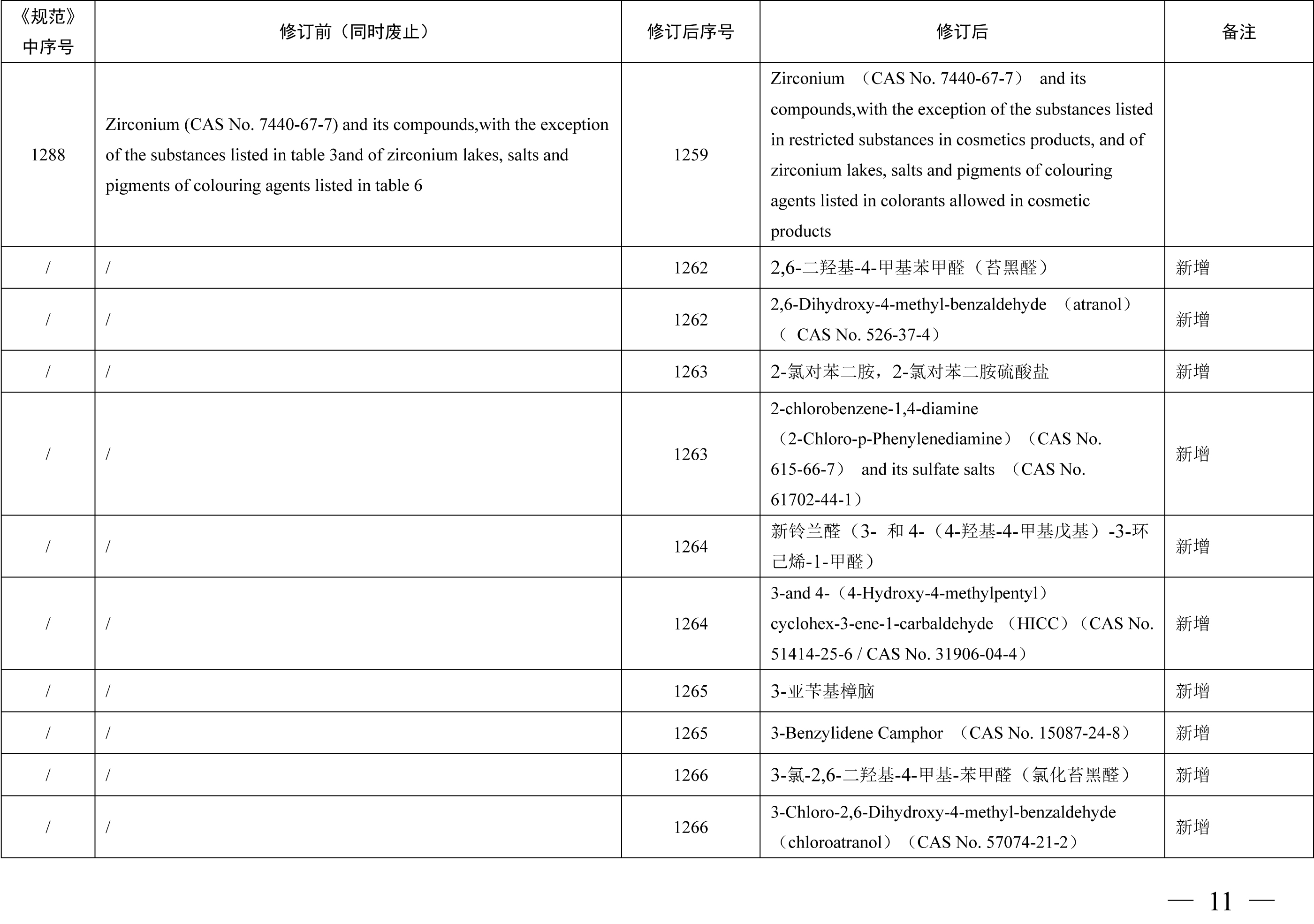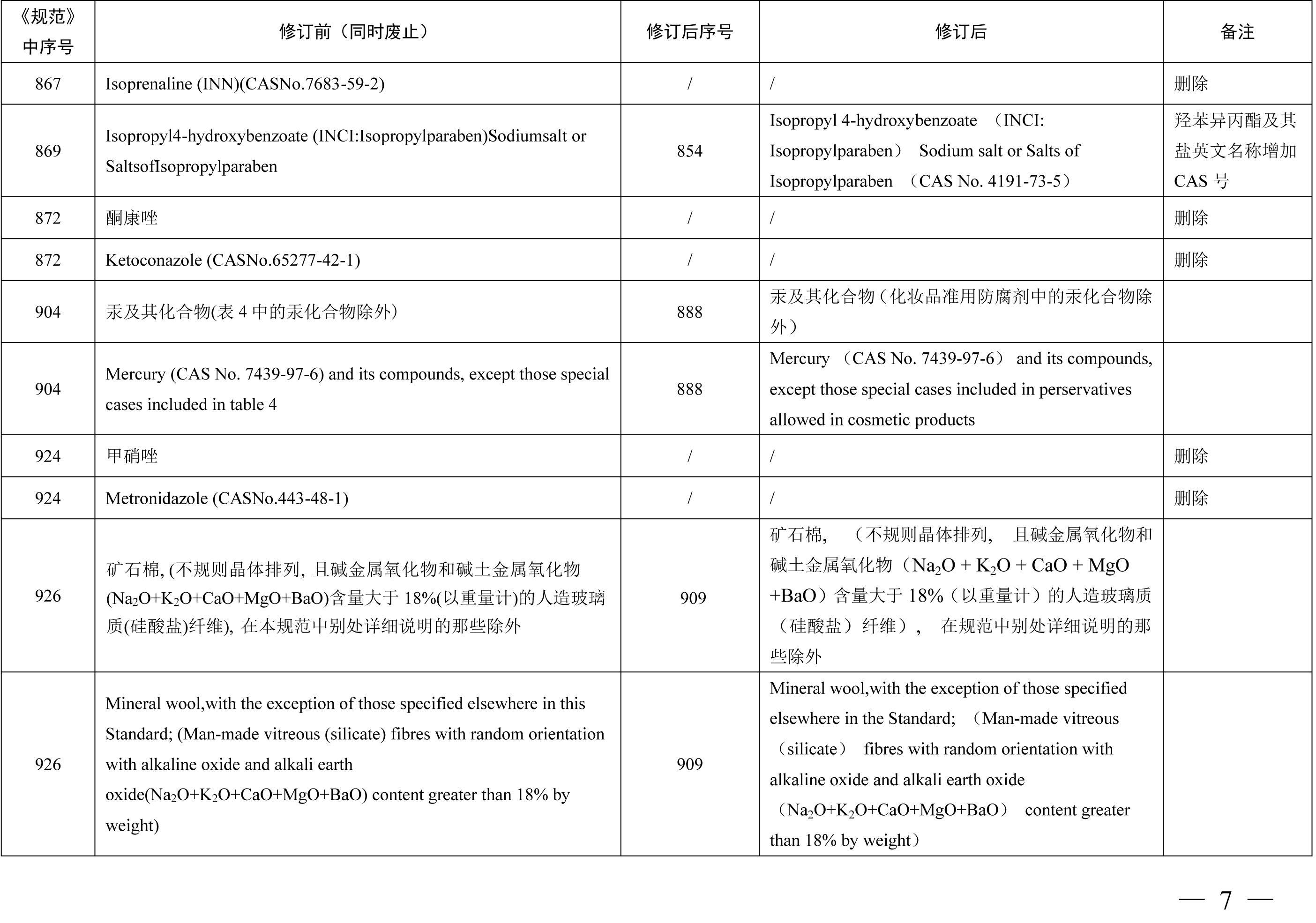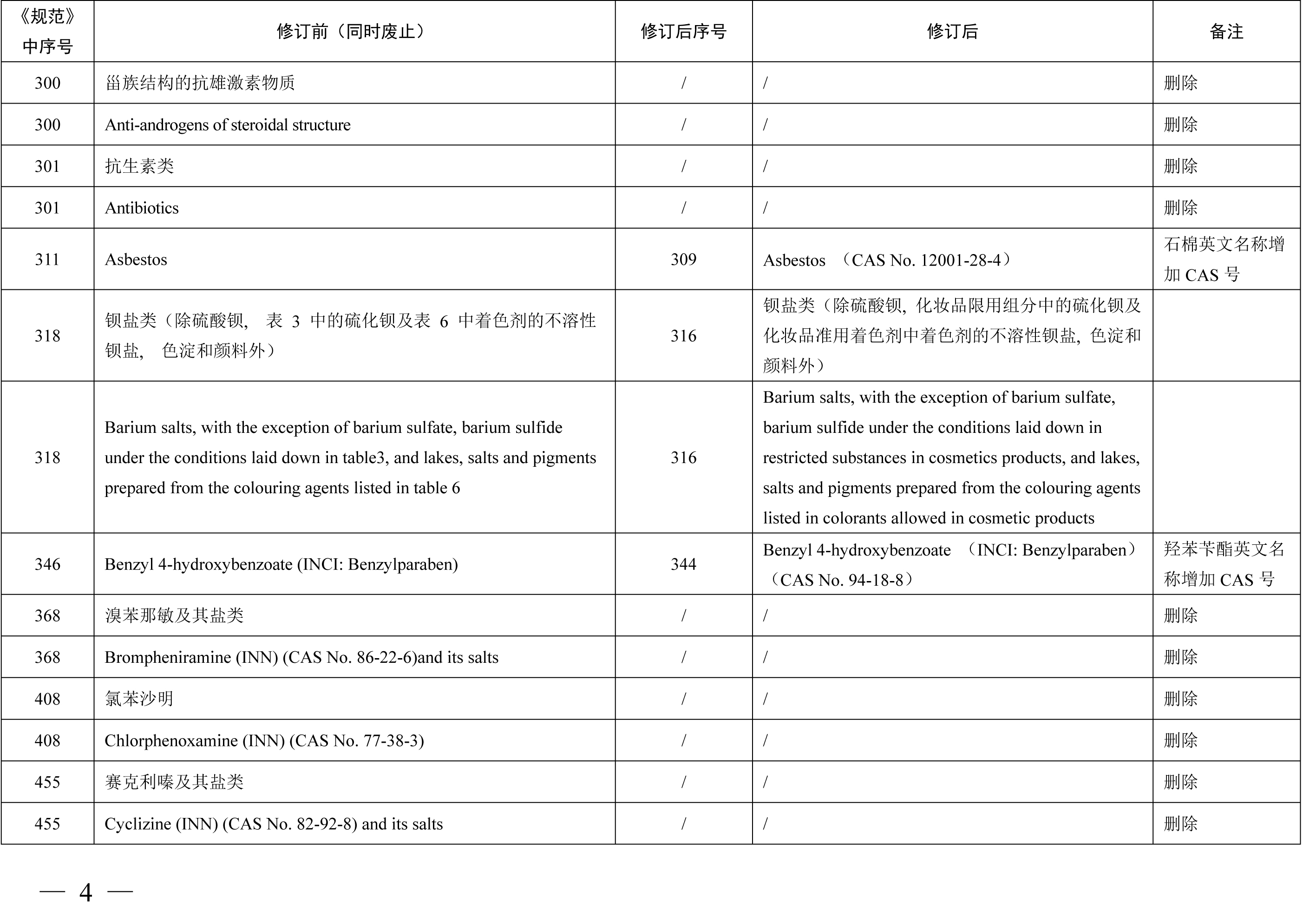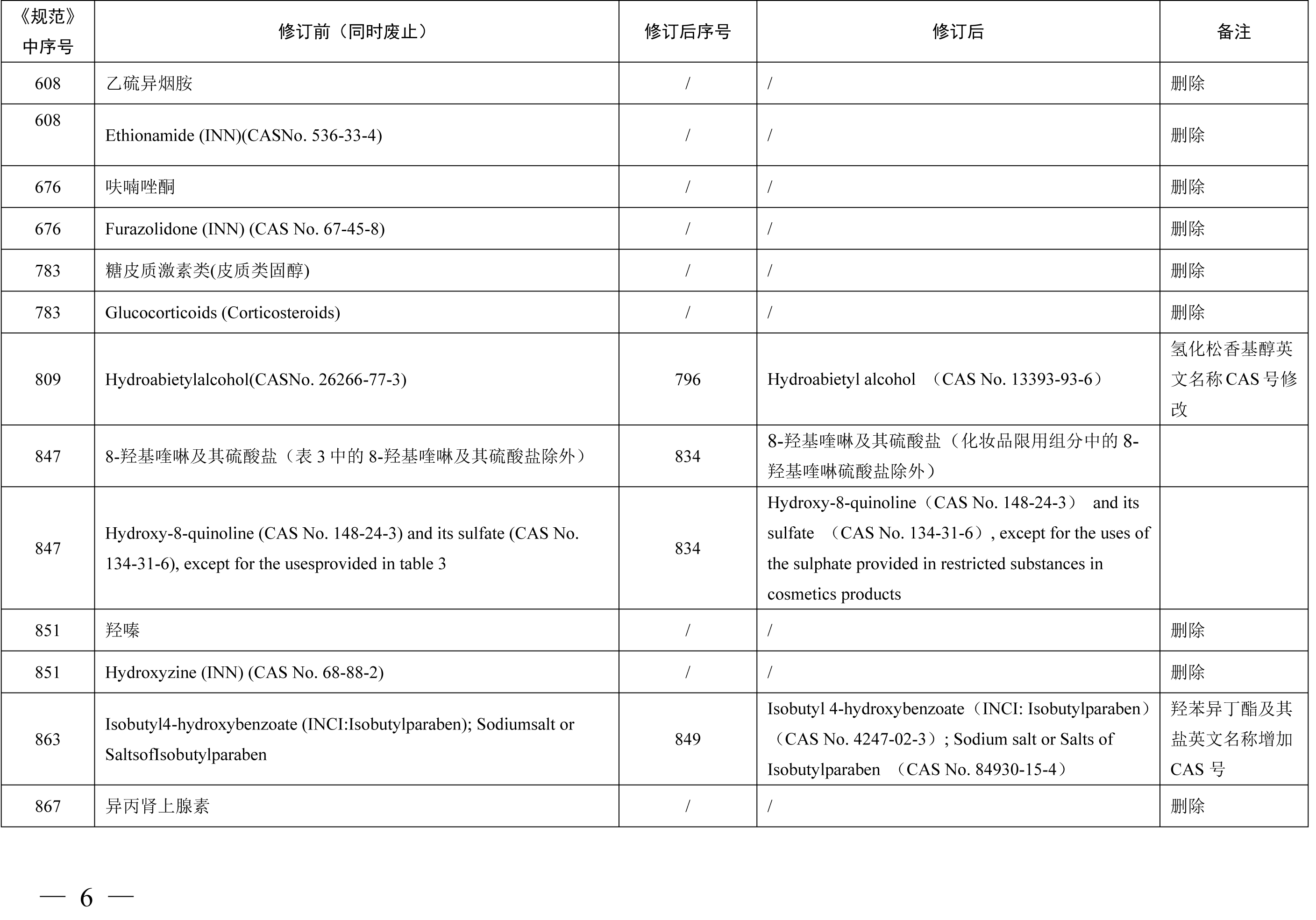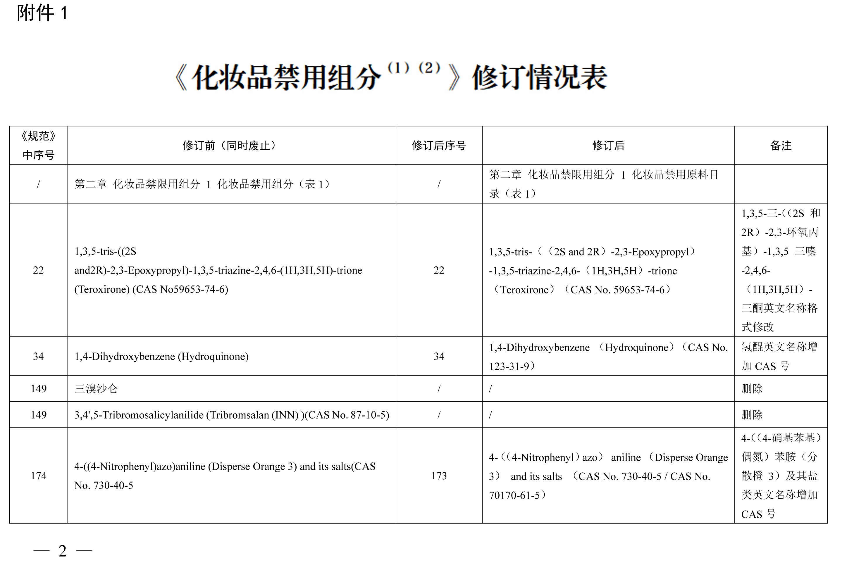 《化妆品禁用原料目录》包括1284项化妆品禁用原料,与《化妆品禁用组分》相比,其中新增24项,修订27项,删除30项。其中新增原料包括2,6-二羟基-4-甲基苯甲醛 (苔黑醛)、3-亚苄基樟脑、环己胺等原料,修订内容包括原料英文名称格式修改、英文名称增加CAS号、英文名称CAS号修改等内容,删除原料30项合并至《化妆品禁用原料目录》第299项、第1279项、第1280项、第1281项。本期小编为您整理了《化妆品禁用组分》修订新增、更新和删除的原料相关信息,具体情况如下表所示。需要重点关注的是化妆品注册人、备案人不得生产、进口产品配方中使用了《化妆品禁用原料目录》规定的禁用原料的化妆品,企业应根据国家化妆品禁用原料目录调整及时停用相关原料。
