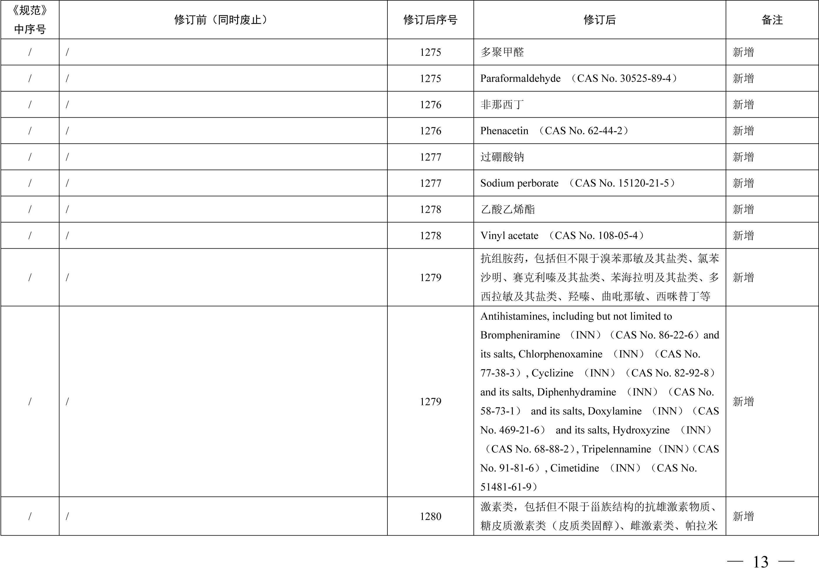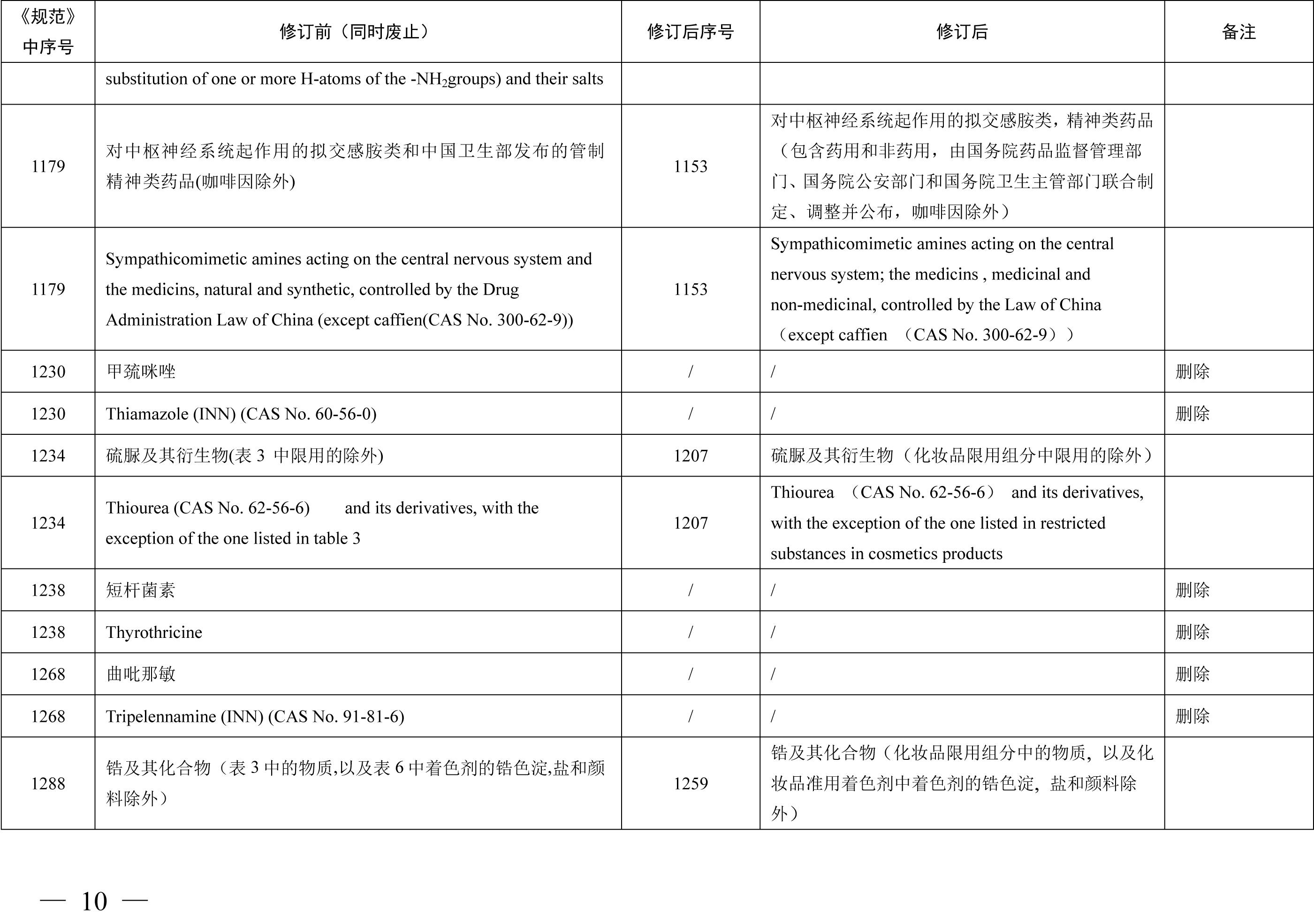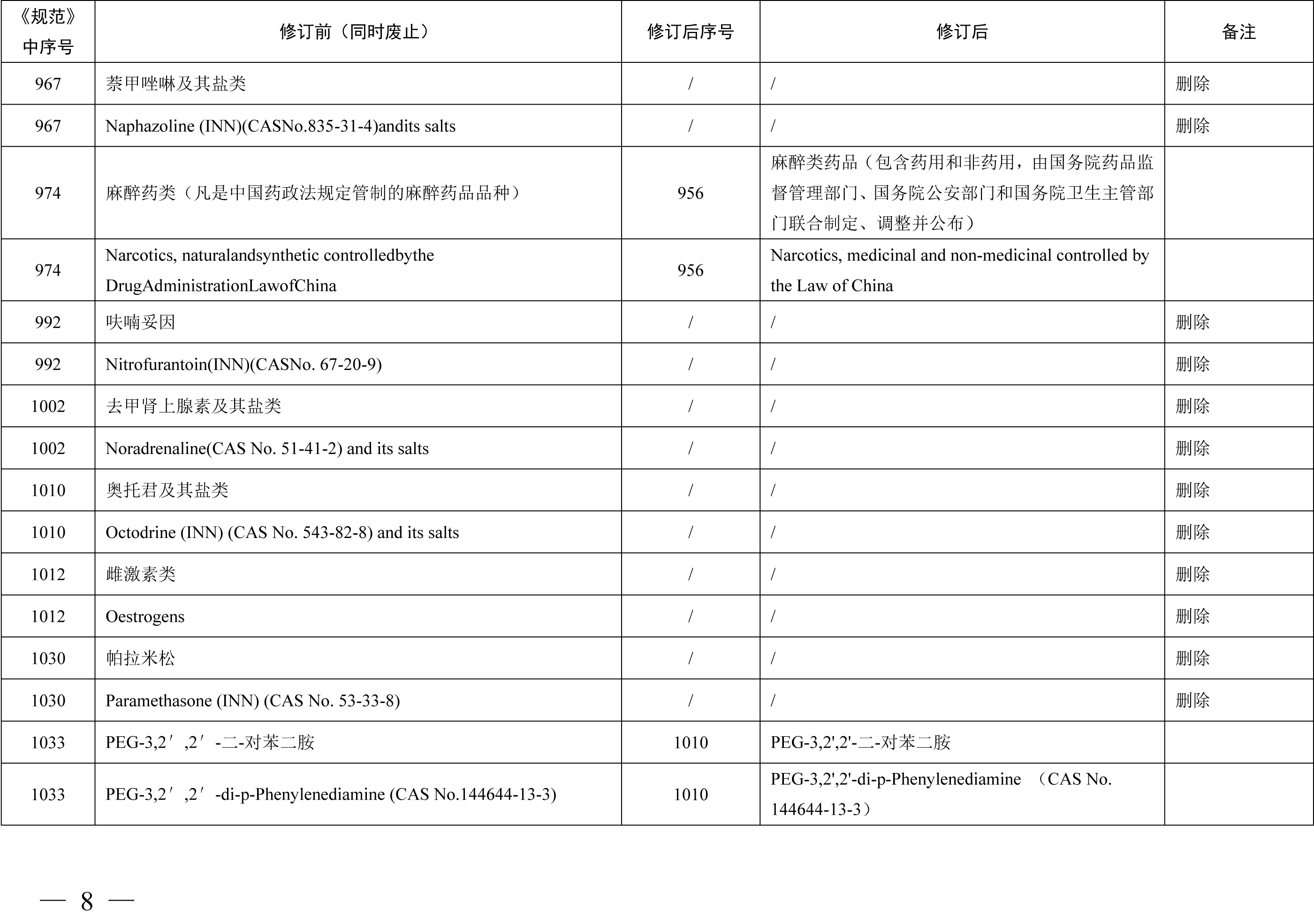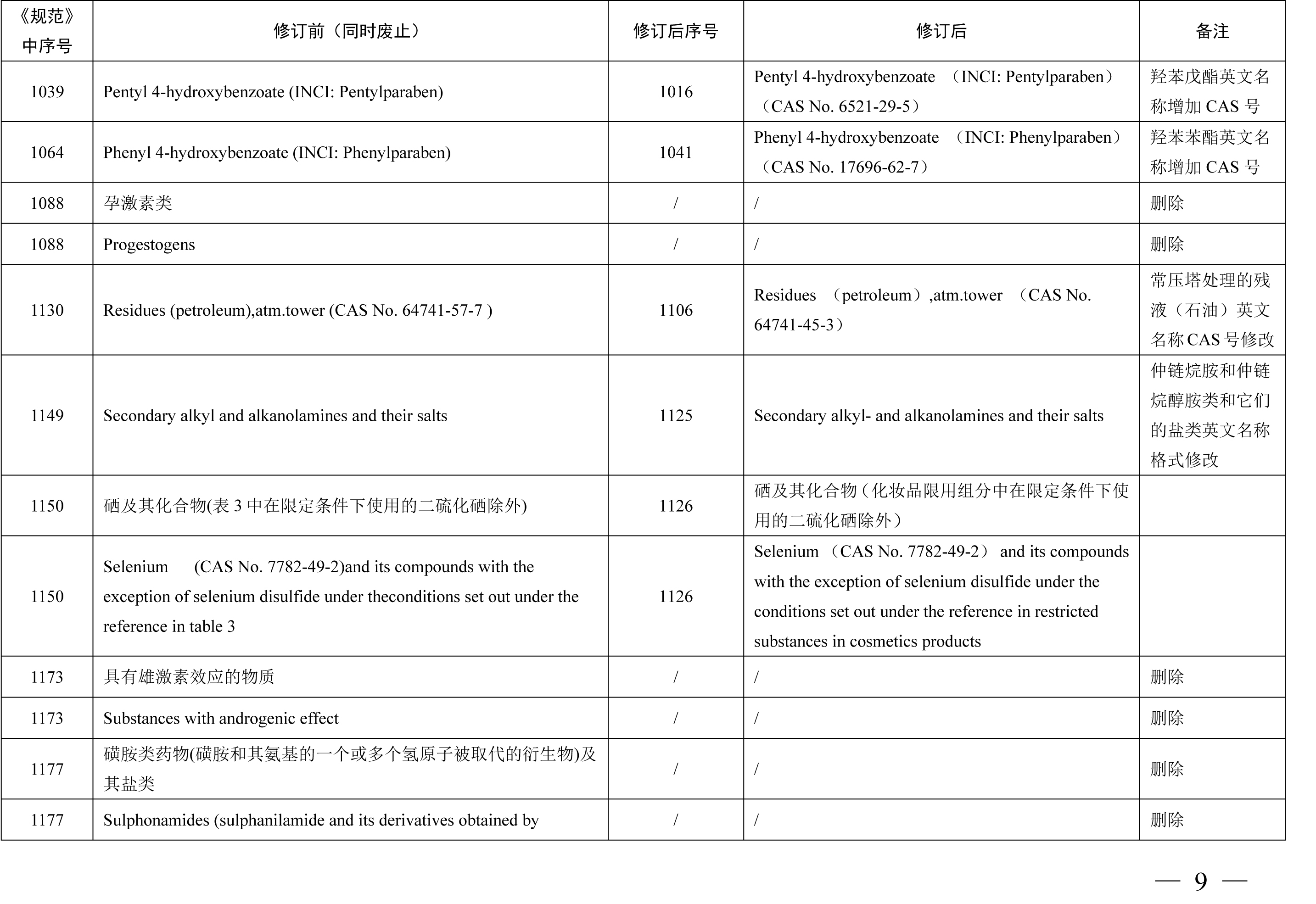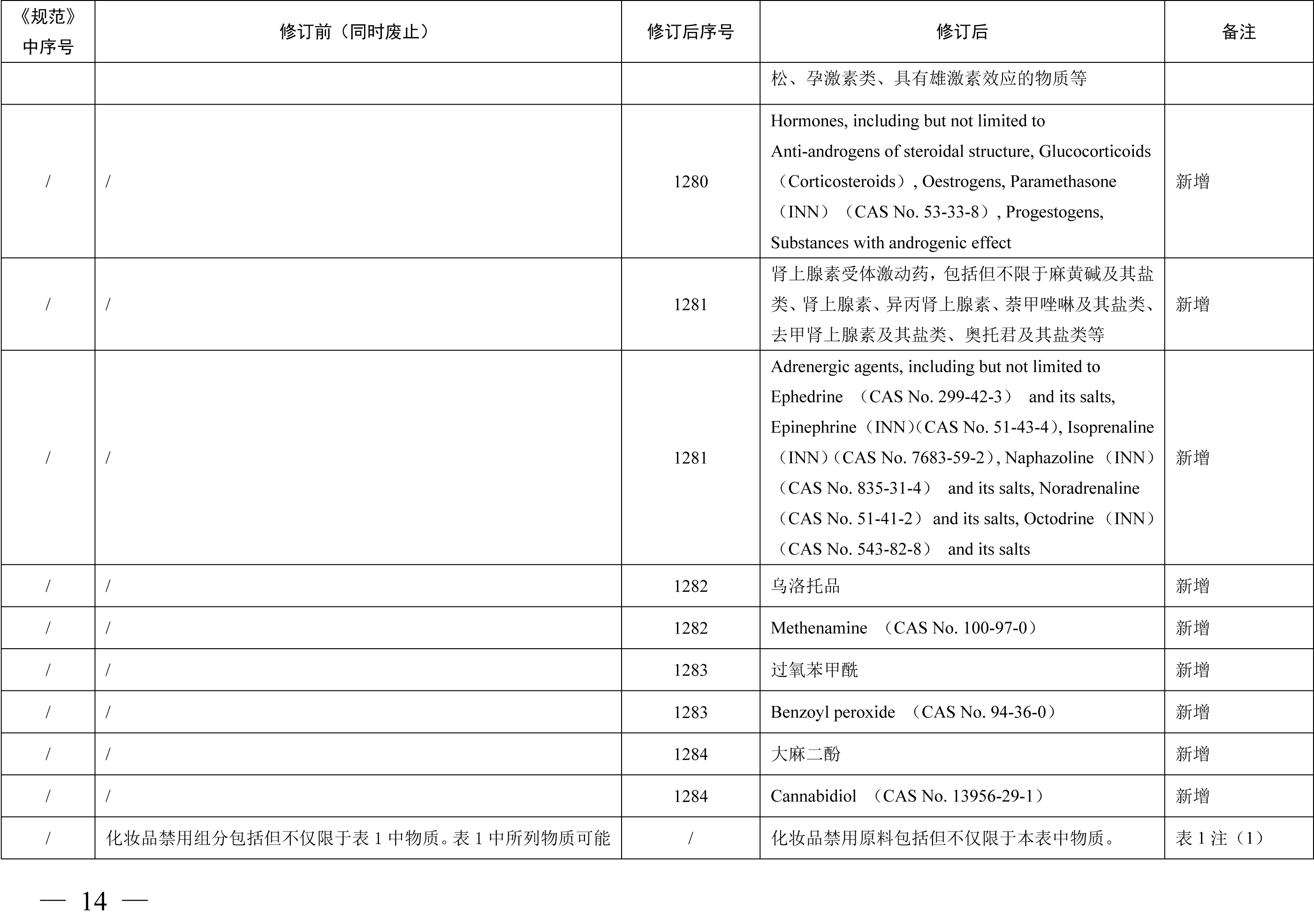 《化妆品禁用原料目录》包括1284项化妆品禁用原料,与《化妆品禁用组分》相比,其中新增24项,修订27项,删除30项。其中新增原料包括2,6-二羟基-4-甲基苯甲醛 (苔黑醛)、3-亚苄基樟脑、环己胺等原料,修订内容包括原料英文名称格式修改、英文名称增加CAS号、英文名称CAS号修改等内容,删除原料30项合并至《化妆品禁用原料目录》第299项、第1279项、第1280项、第1281项。本期小编为您整理了《化妆品禁用组分》修订新增、更新和删除的原料相关信息,具体情况如下表所示。需要重点关注的是化妆品注册人、备案人不得生产、进口产品配方中使用了《化妆品禁用原料目录》规定的禁用原料的化妆品,企业应根据国家化妆品禁用原料目录调整及时停用相关原料。