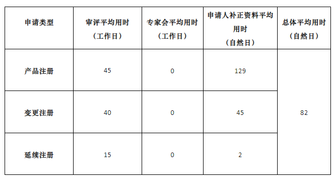 2、申请人补正资料平均用时=补正资料总用时/相关项目审结转出总数量;总体平均用时=产品注册、变更注册、延续注册的总用时/相关项目审结转出总数量。