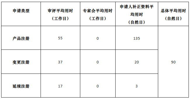 1、审评平均用时均为工作日;申请人补正资料平均用时和总体平均用时均为自然日。